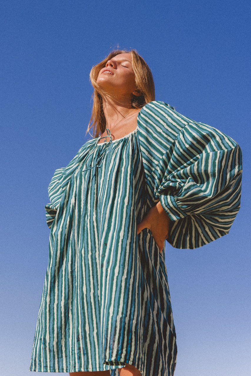 The Ria Mini Dress has been ethically handcrafted with 100% cotton into the most comfortably soft, billowing silhouette. Featuring an adjustable gathering at the neckline with a tie, pockets, and cuffs to finish the delightfully large sleeves. Our very first screen printed style, the making of this garment serves to support the preservation of hand craftsmanship and women empowerment in India.