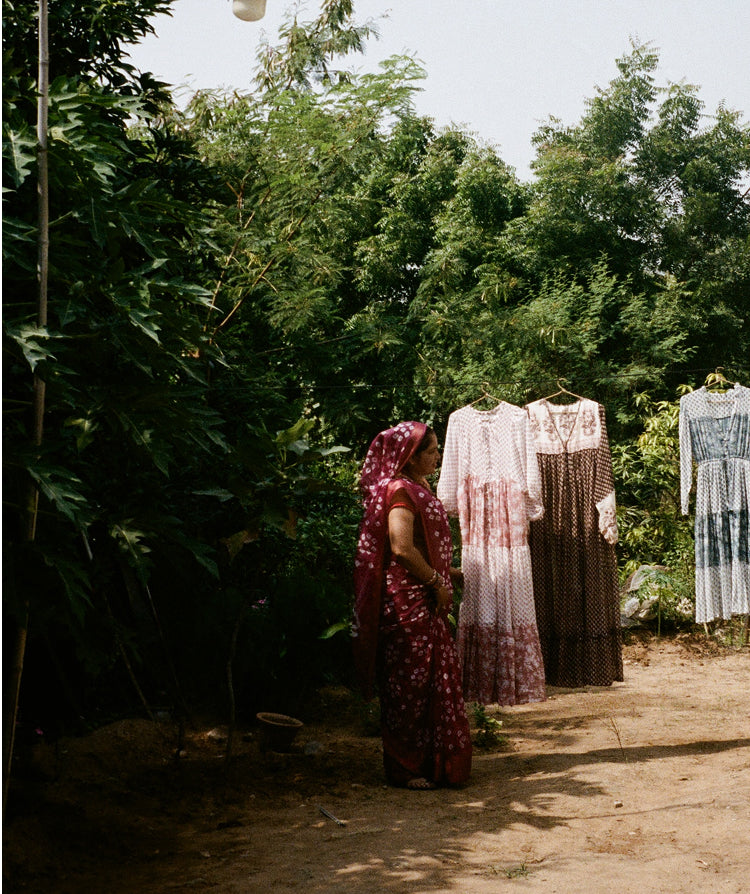 Our slow fashion garments support Indian women and preserve ancient textile methods. We follow a zero-waste design process, producing minimal quantities to avoid excess waste. Every purchase aids women empowerment projects in India and supports local communities in sustainable craftsmanship.