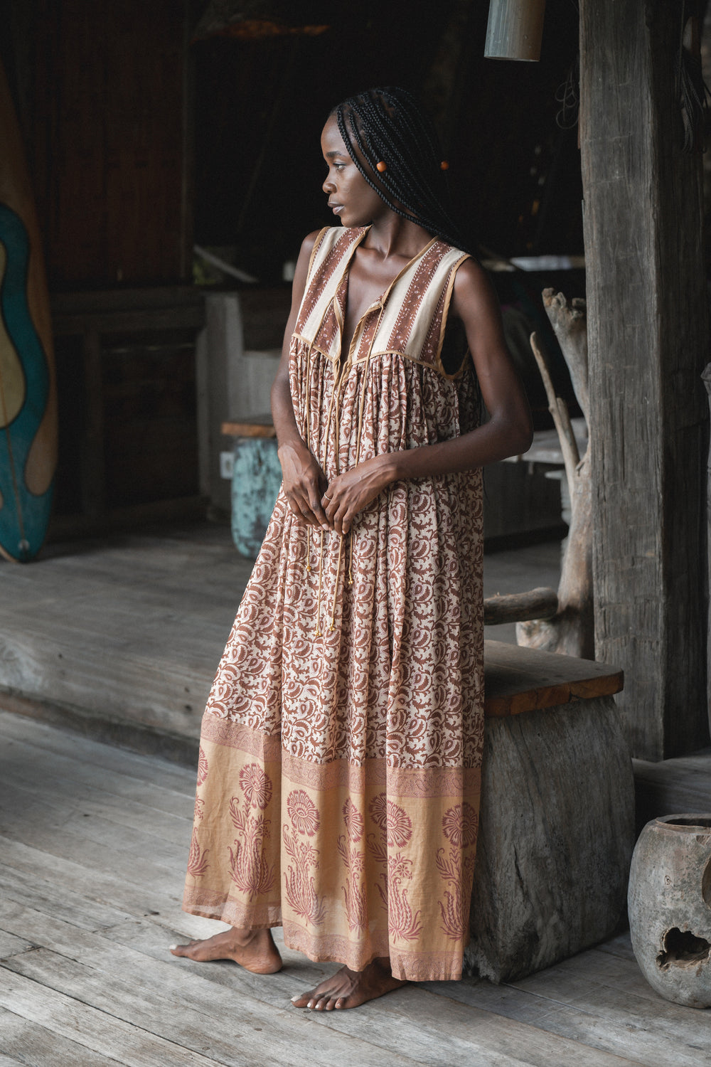 A magic piece made of lightweight 100% cotton adorned with beautiful Indian designs in a mix of brown and burgundy tones. This sleeveless maxi is designed to be loose fitting and floaty, with two optional front ties decorated with golden bell chimes.