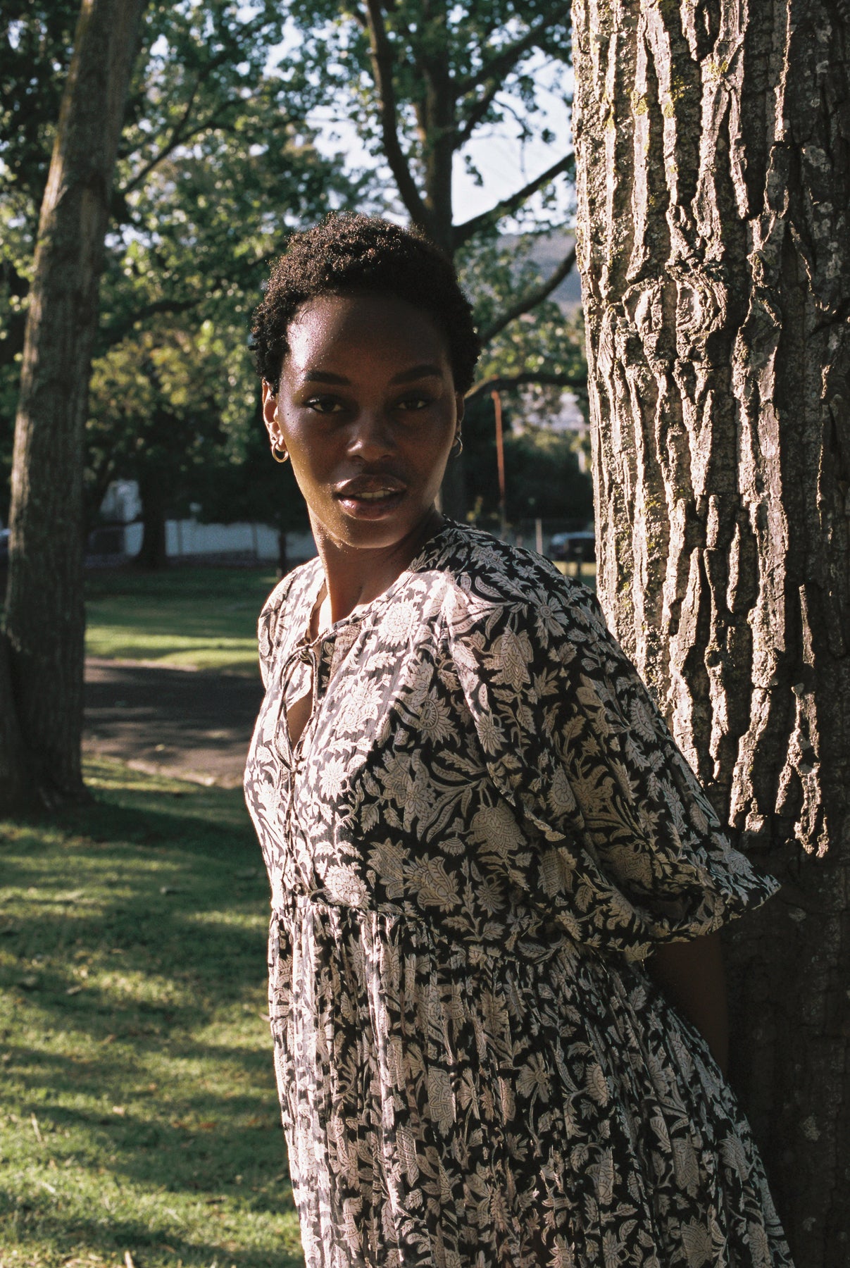 Daughters of India Kyra Midi Dress in Pepper — side view by twisted mangrove tree, cotton